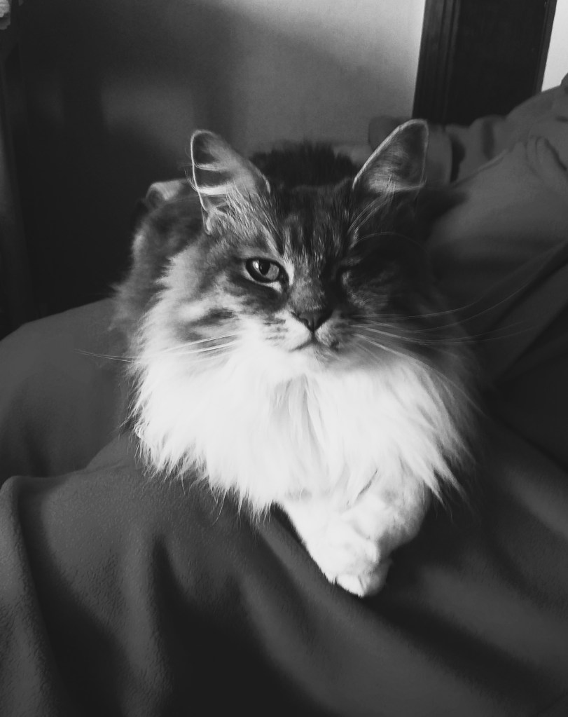 Love and respect the three humans of your household. Bite and scratch the three humans of your household to help them remember they have O- blood, and make them forget you have half your teeth. Cuddle with the Mom in the master bedroom but only to get at the heating pad. The heating pad is yours forever.